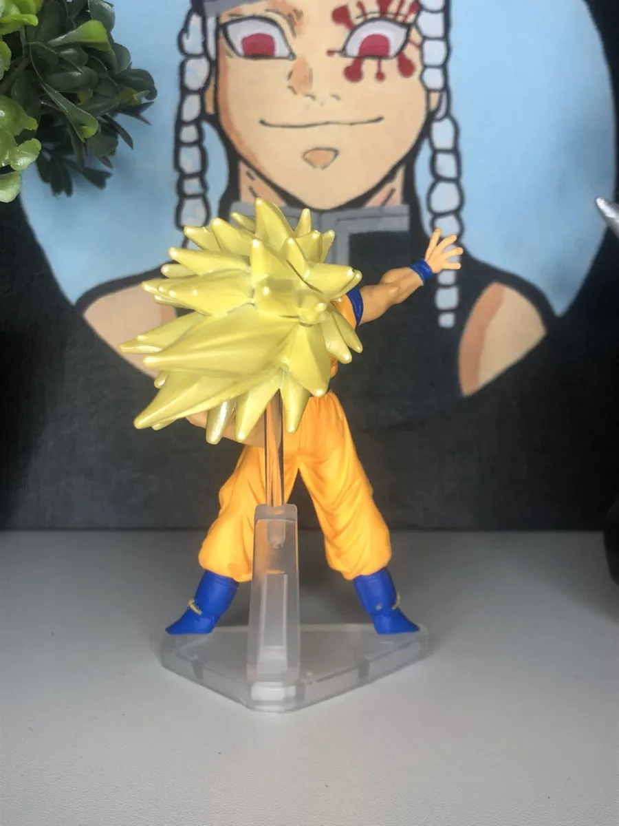 ~12 cm avec les cheveux, pose bras levé légendaire, tige transparente pour soutenir la crinière, gi orange/bleu impeccable. Très bon état ++ : zéro casse sur les cheveux (point fragile !), peinture comme neuve.
