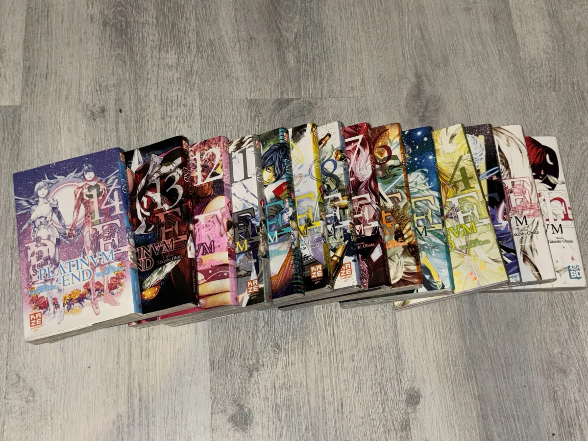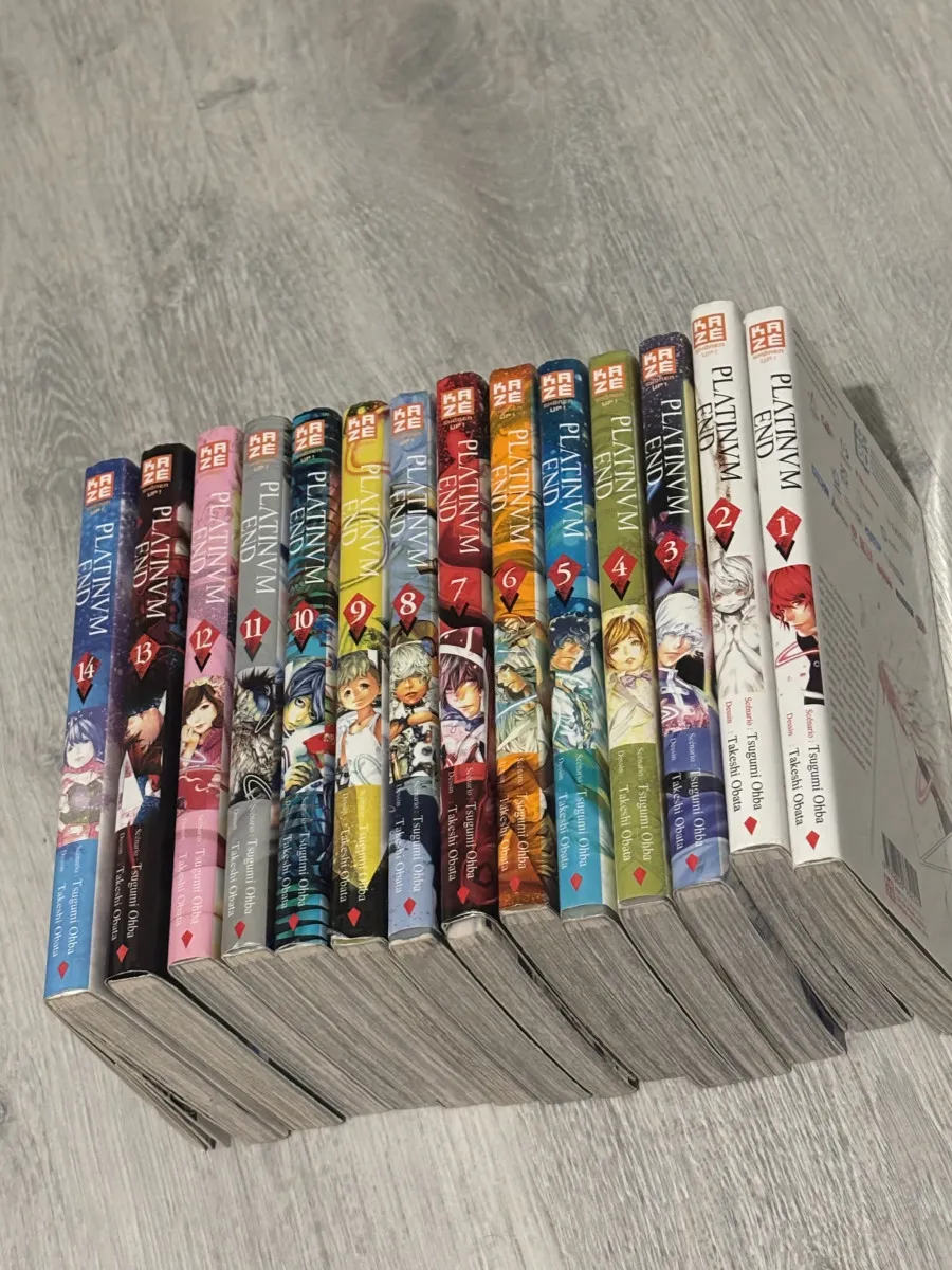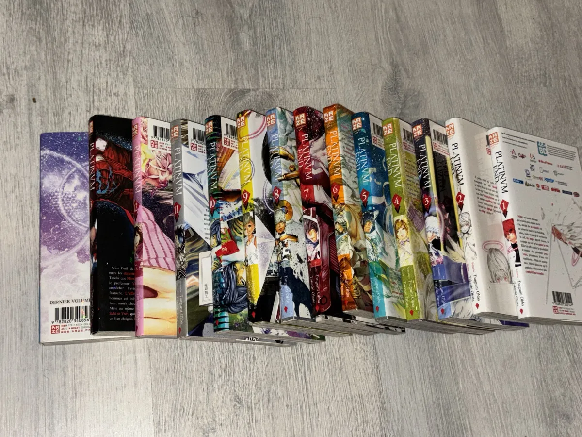 Collection complète de 14 tomes du manga Platinum End. Les couvertures sont colorées et en super état.