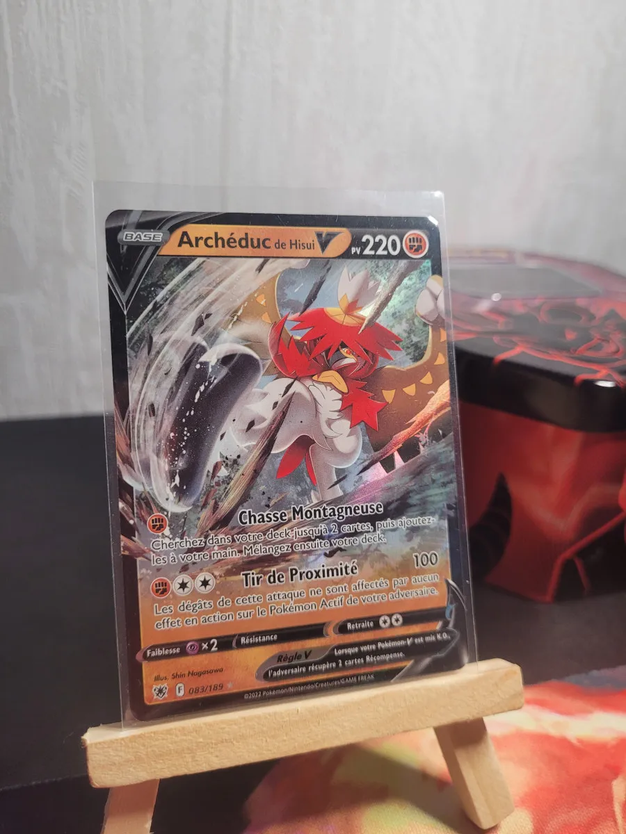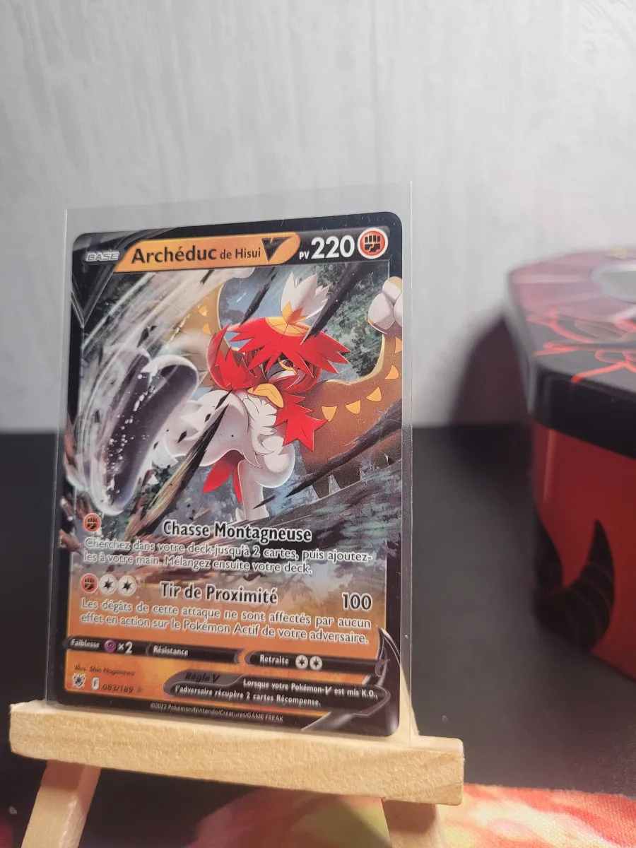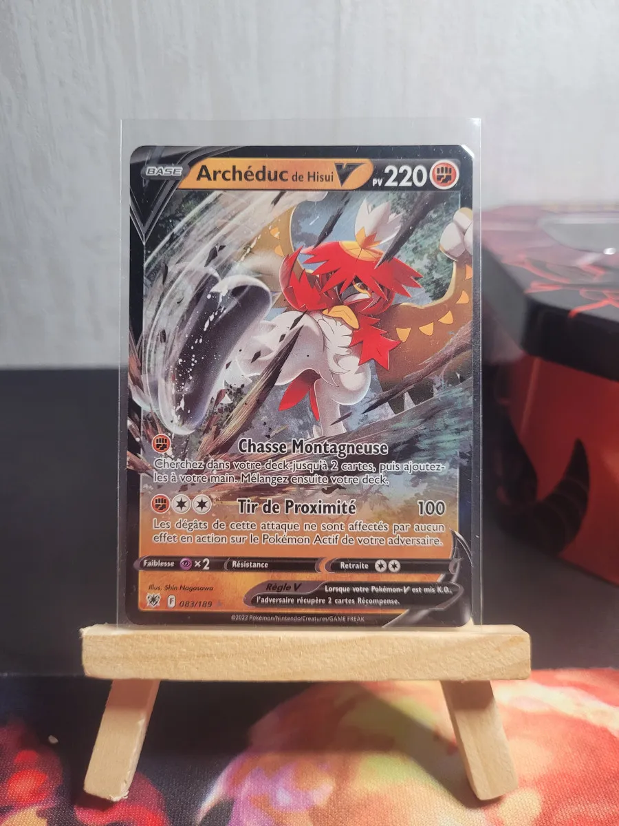 Carte Archéduc de Hisui V en version française, superbe illustration et finition brillante. Idéale pour compléter un deck ou une collection centrée sur les formes de Hisui. Carte propre, brillante, sans défaut majeur.
