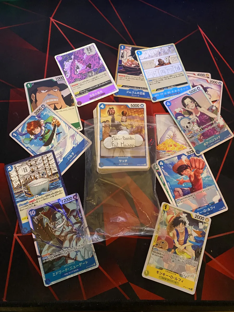 Je vends des mini booster de 55 cartes tcg one piece .Ce booster contient des cartes: