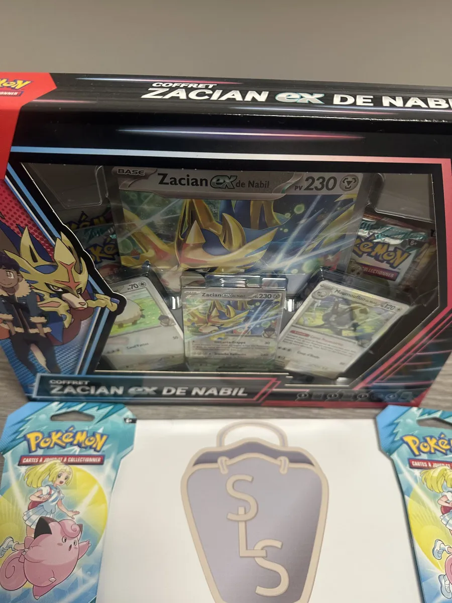 Lot Pokémon comprenant, 1 coffret Zacian-ex de Nabil et 2 boosters EV09 Aventures ensemble en français.
