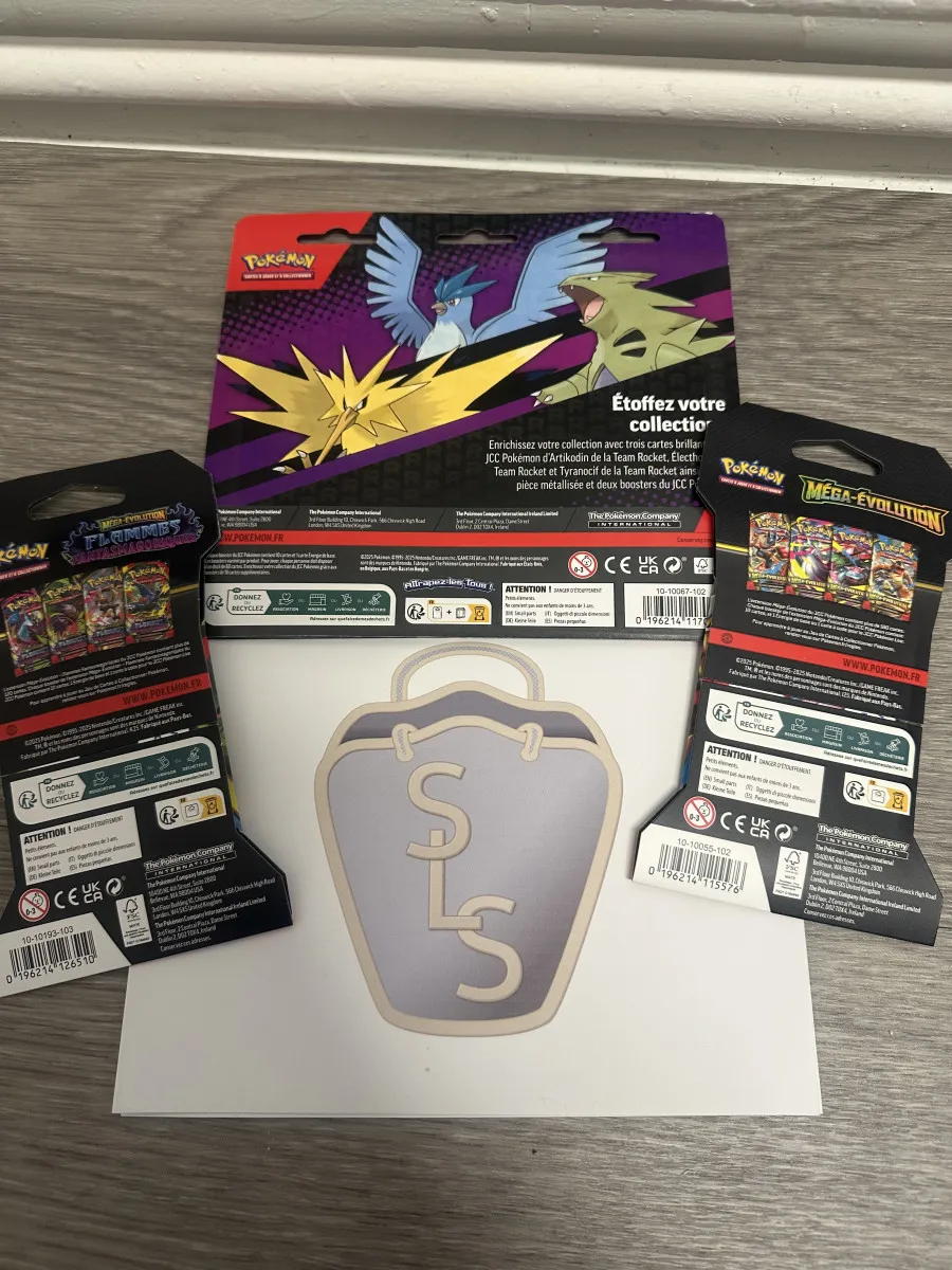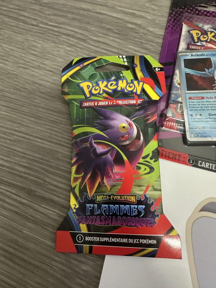 Lot Pokémon comprenant, 1 Duopack Electhor + 1 booster ME01 Méga-évolution et 1 booster ME02 Flamme fantasmagorique en français.