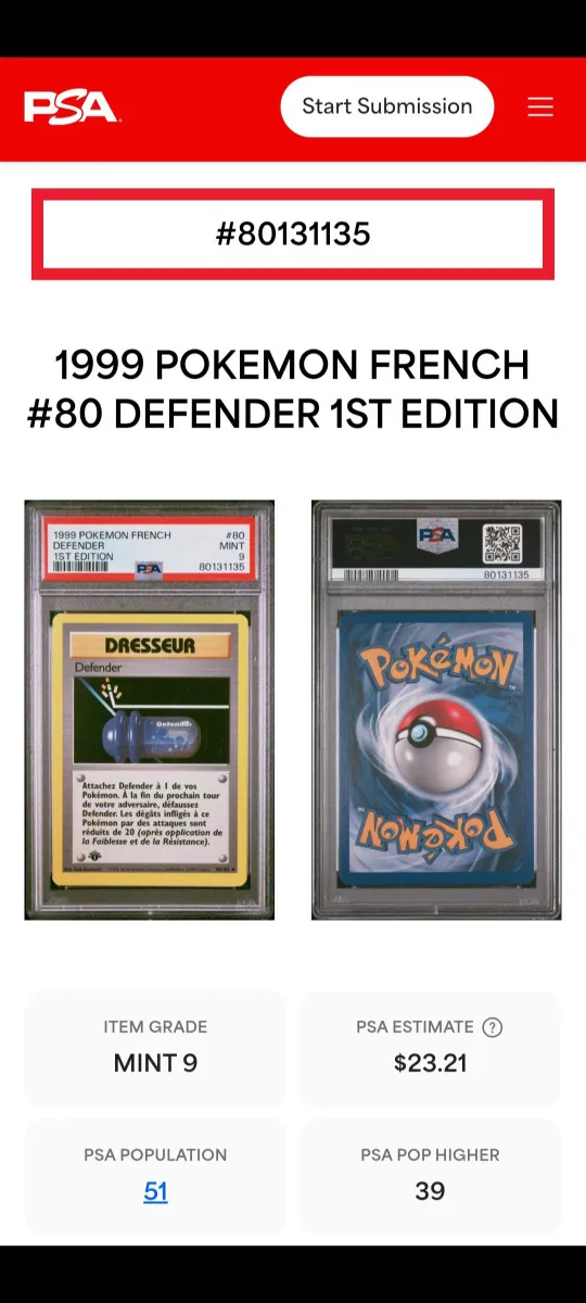 Voir plusPokémon PSA 9 Dresseur Defender 80/102 Édition 1 NM MT 🤩 Set de Base PCA CCC