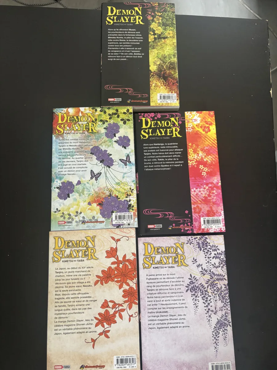 Je vends un lot de 5 tomes de Demon Slayer (Kimetsu no Yaiba) en très bon état.
