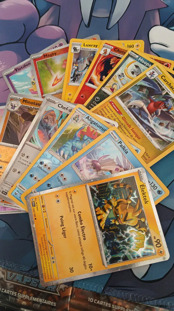 Toutes les cartes de ce paquet sont NEUVES, OFFICIELLES, sans AUCUN DOUBLE, et bien évidemment FRANÇAISES. Elles sont issues de boosters de différentes séries (anciennes comme nouvelles) et n'ont JAMAIS été jouées.