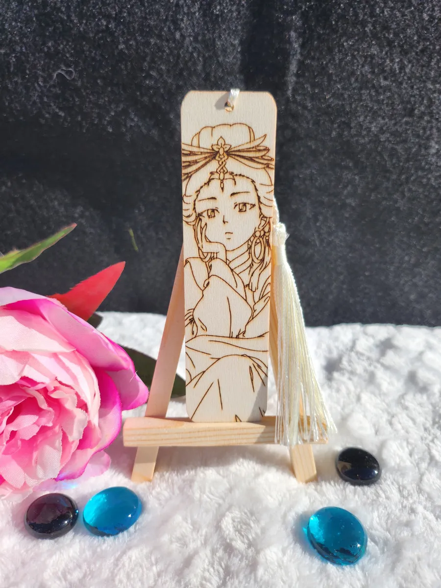 En bois gravé au laser avec des designs de ma création, du manga « les carnets de l’apothicaire ».