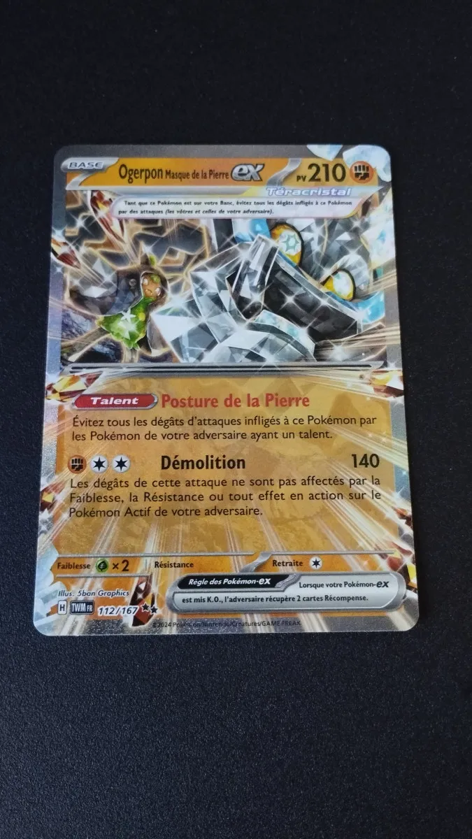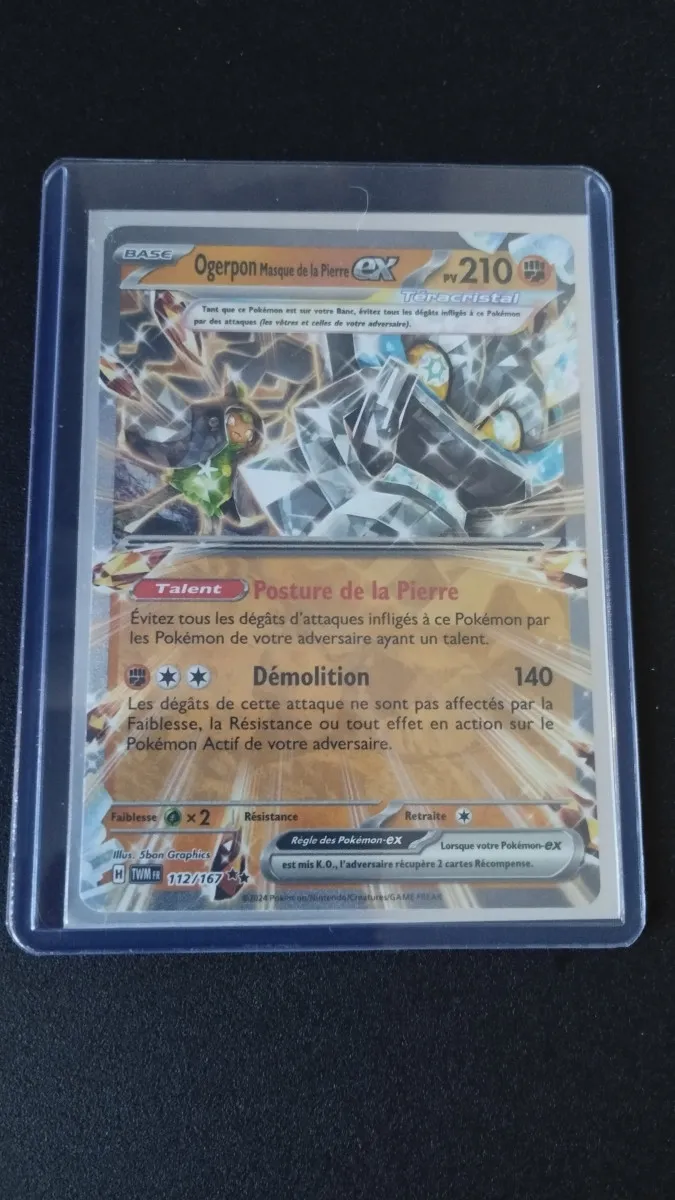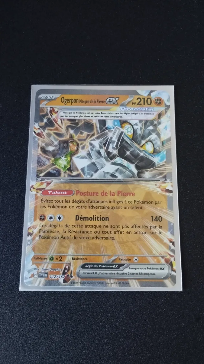 Je vend cette carte Ogerpon Masque de la Pierre Ex du Bloc Écarlate et Violet mise sous protège carte puis Top Loader.