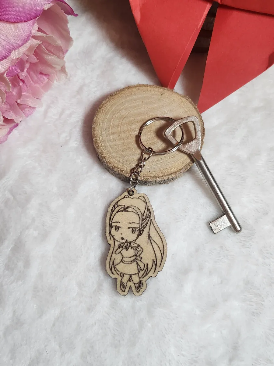 Dessin réalisé par moi dans mon style Chibi, gravé et découper au laser sur du bois de contreplaqué de Boulot de 3 mm d'épaisseur.