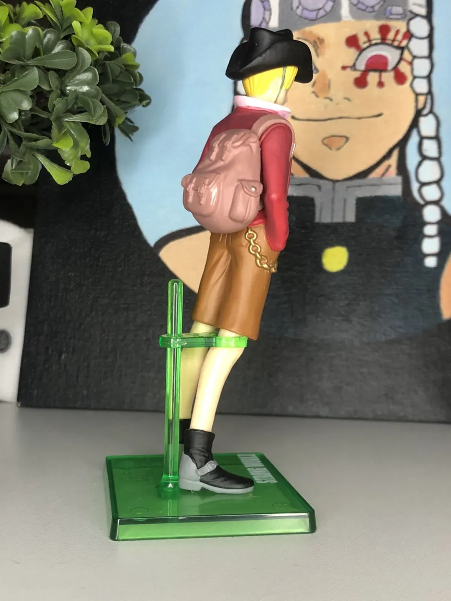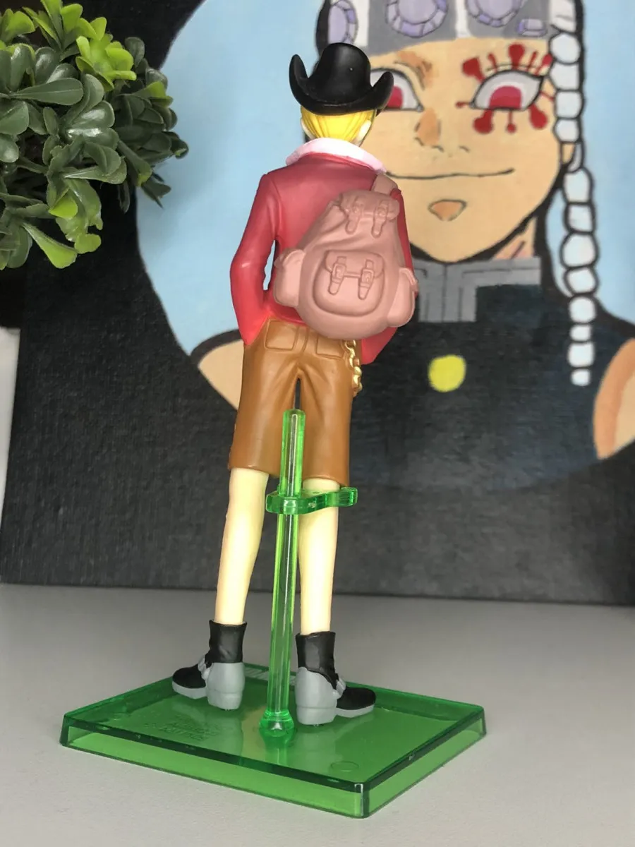 ~15-18 cm PVC, pose cool main en poche, chapeau noir, veste rouge, short marron, collier + sac à dos. Détails top : peinture impeccable, zéro rayure/casse, version UFO catcher exclusive Japon avec support vert "Strong World".