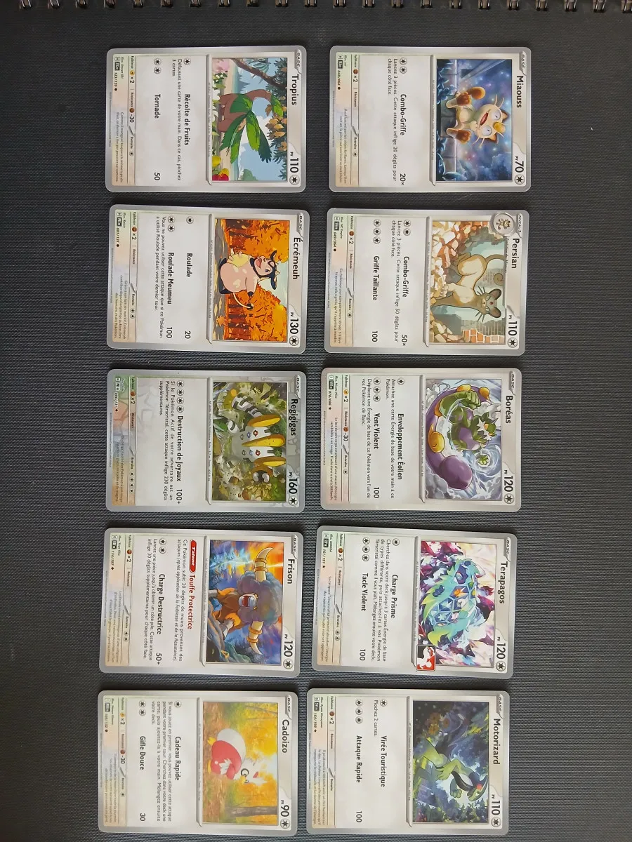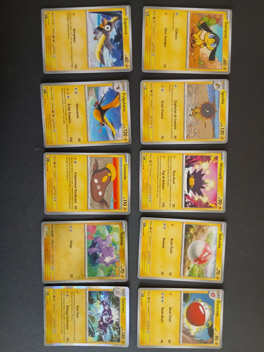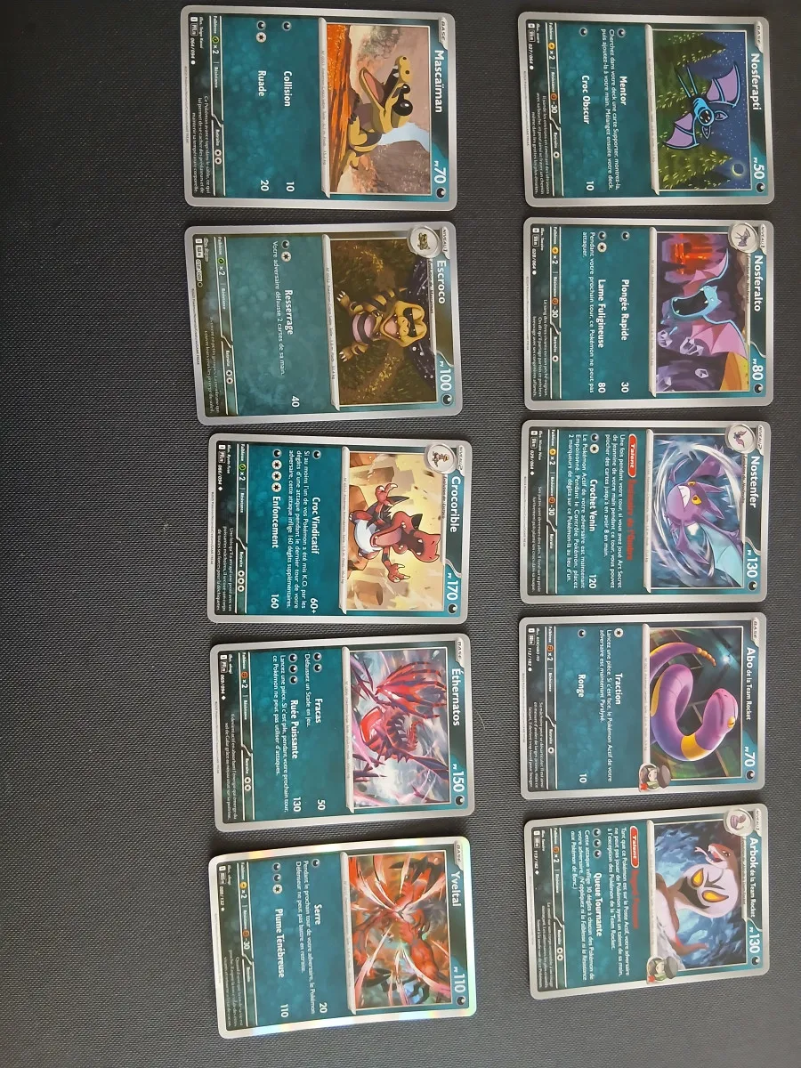 Lot de 80 carte, 10 de chaque type : feu, électrique, psy, plante, ténèbres, combat, eau et incolore. Chaque type à une holographique commune ou peu commune et une holographique rare.