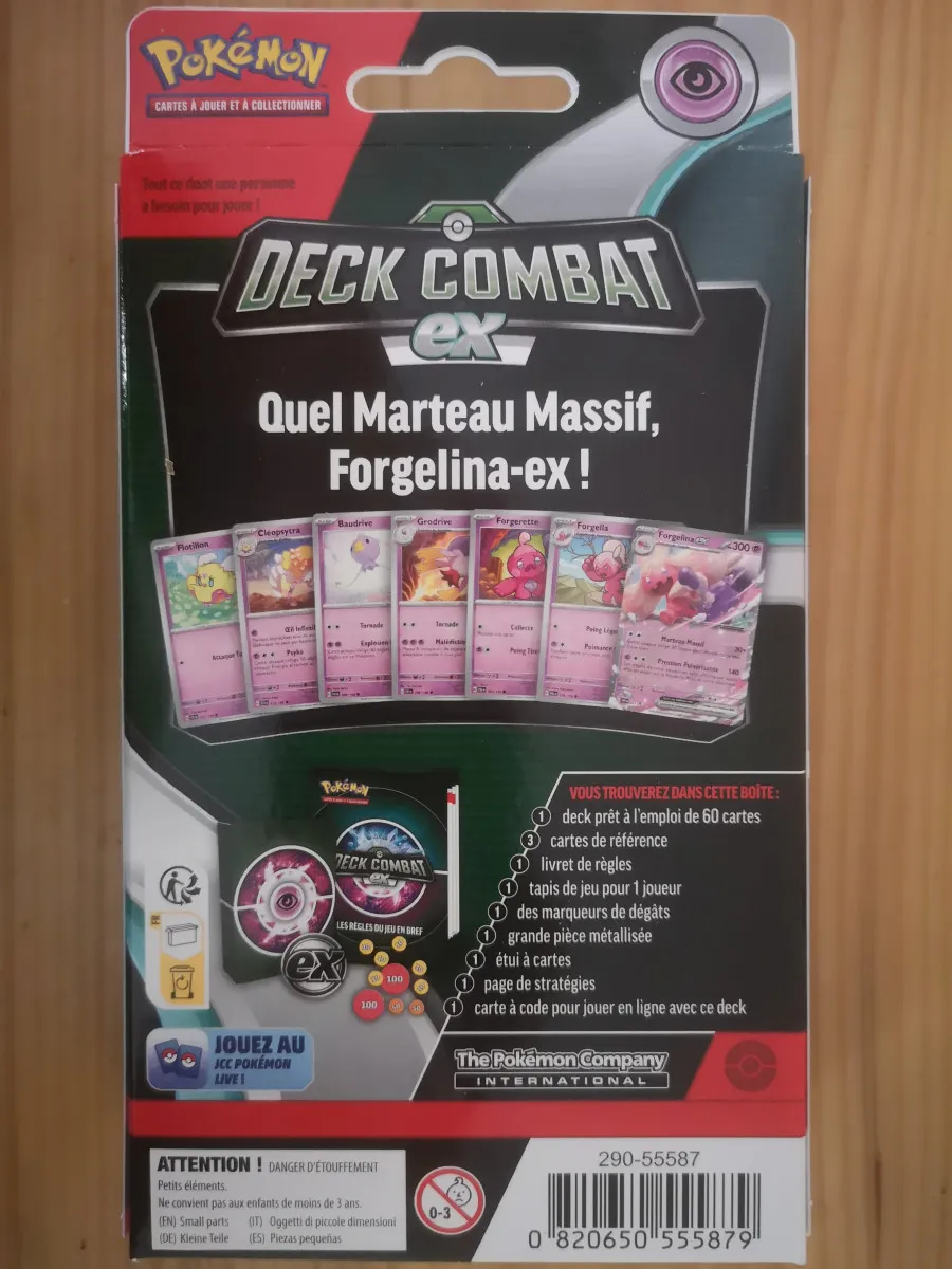 Cher(e)s petit(e)s fans, collectionneuses et collectionneurs ❤️😊, c'est avec beaucoup de plaisir que je vous propose le DECK Combat EX Forgelina-ex Officiel, Neuf et Scellé ✨🎁. Il comprend 1 deck prêt à l'emploi de 60 cartes, 3 cartes de références, 1 livret de règle, 1 tapis de jeu pour 1 joueur, des marqueurs de dégâts, 1 grande pièce métallisée, 1 étui à cartes, 1 page de stratégies, 1 carte à code. C'est également avec très grand plaisir que je vous le propose comme OFFRE TOP PROMO ✨👊, en espérant que vous en profiterez pleinement. Je vous en souhaite dès à présent un excellent achat 🎋🎁. A bientôt, bien cordialement. Et vive POKEMON 😉 !