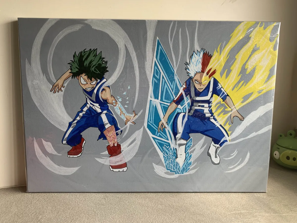 My Hero Academia, Midoriya et Todoroki sur toile 100% coton, peinture acrylique, 38x55cm, sous film neuf.