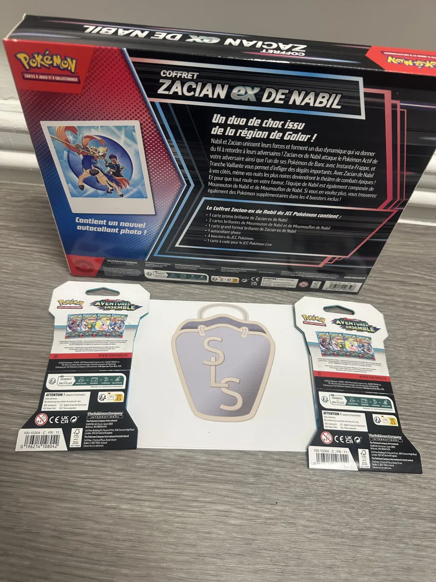 Lot Pokémon comprenant, 1 coffret Zacian-ex de Nabil et 2 boosters EV09 Aventures ensemble en français.