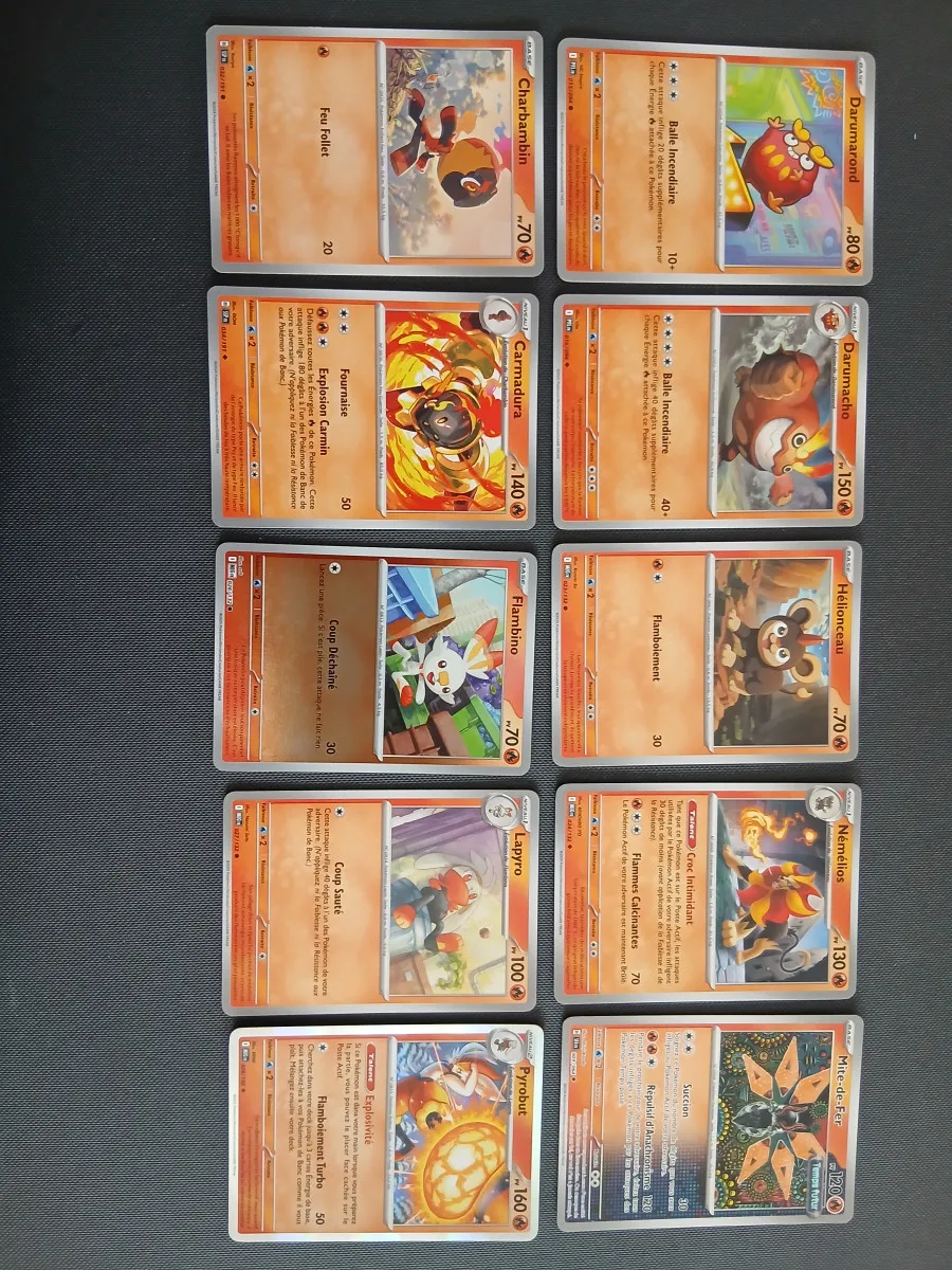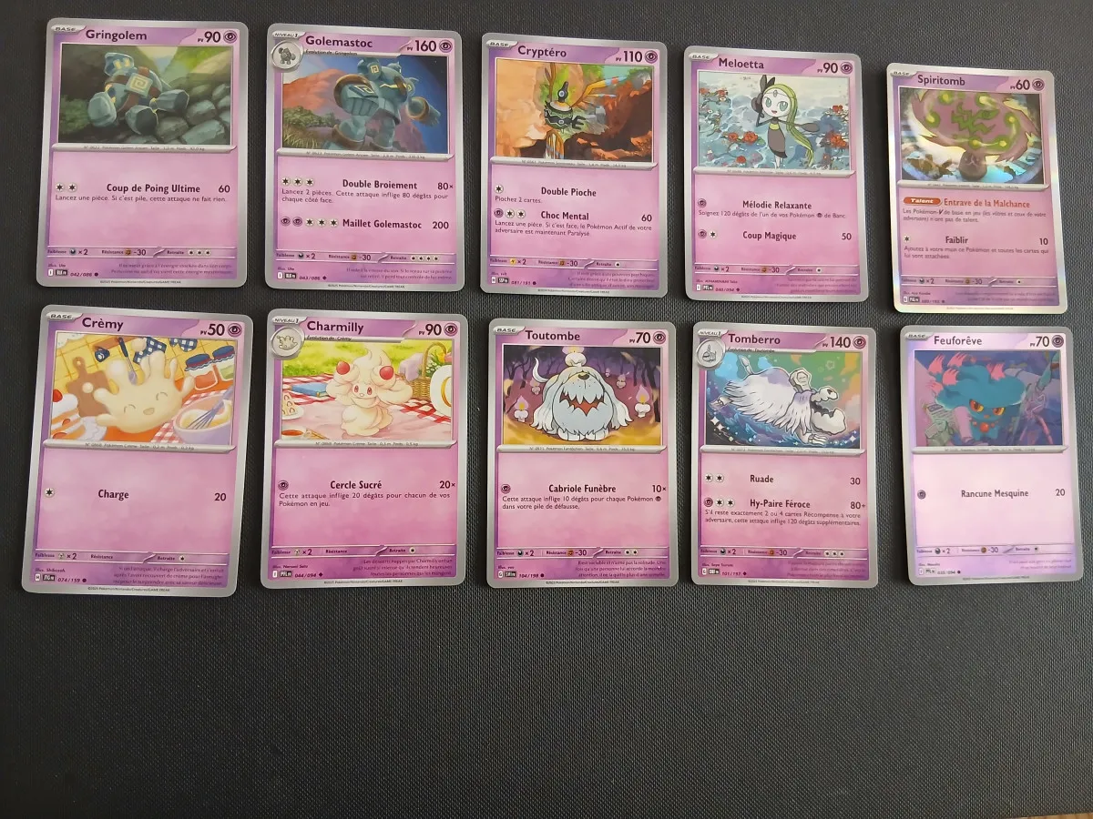 Lot de 80 carte, 10 de chaque type : feu, électrique, psy, plante, ténèbres, combat, eau et incolore. Chaque type à une holographique commune ou peu commune et une holographique rare.